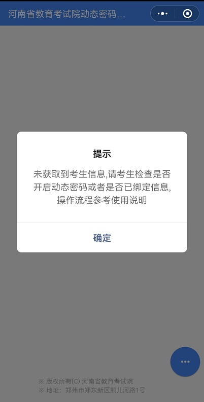 考生关注“河南省教育考试院”微信公众号,绑定考生号可以提升账号安全性,建议有条件的考生进行绑定,绑定考生信息后微信界面会自动显示动态密码。如考生多次验证不通过或动态密码不显示,可点击小程序内右下角刷新按钮,重新刷新加载当前页面进行尝试。